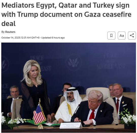 中新网10月14日电 据路透社报道,当地时间13日,美国总统特朗普在埃及沙姆沙伊赫与埃及、卡塔尔、土耳其领导人共同签署加沙停火协议文件。